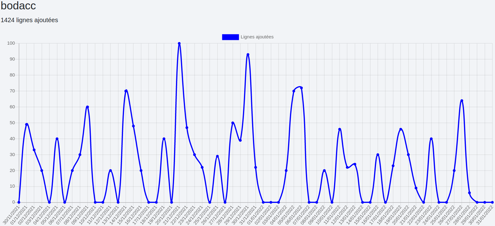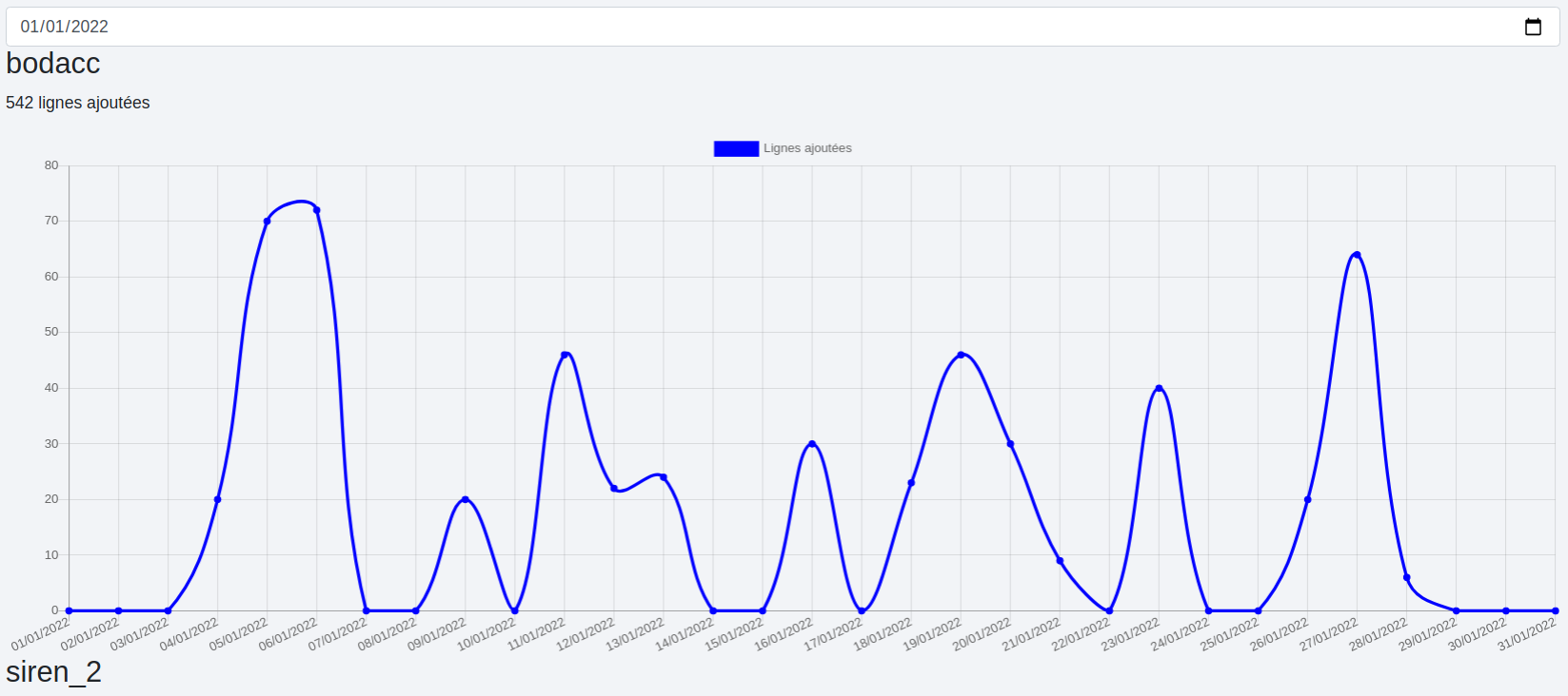 Colonne utilisée dans les courbes de mises à jour de la table. Par exemple ici, la colonne "date_publication" permet d’obtenir le nombre de lignes ajoutées journalièrement dans la table "bodacc" visible dans le tableau de bord de la base de données.