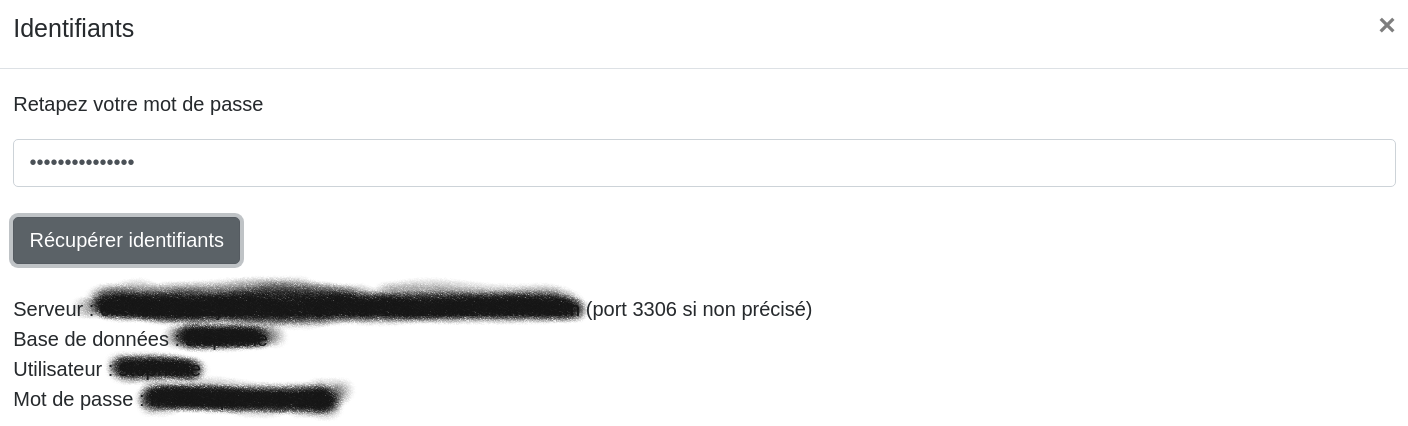 ouvre une fenêtre où il est possible d’entrer son mot de passe utilisateur pour récupérer les identifiants de connexion de la base de données à rentrer dans MySQLWorkbench par exemple.