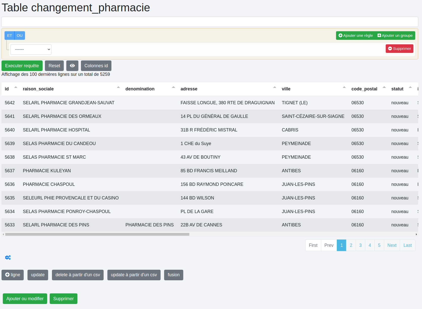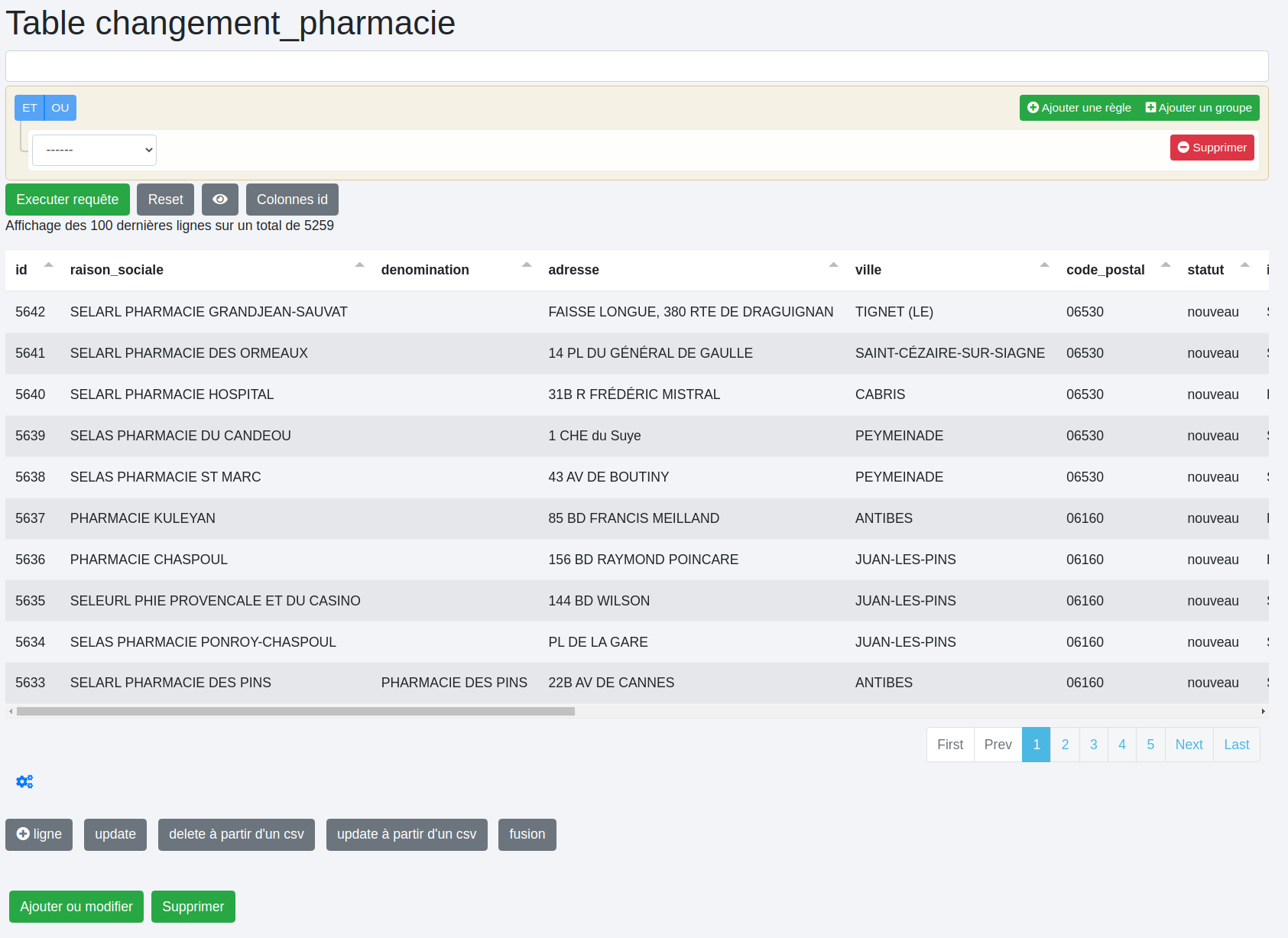 Nom du bouton sous lequel apparaîtra le traitement dans la vue de la table. Par exemple, nous avons bien deux boutons d’action "Ajouter ou modifier" et "Supprimer" en bas de la vue de la table "changement_pharmacie" :