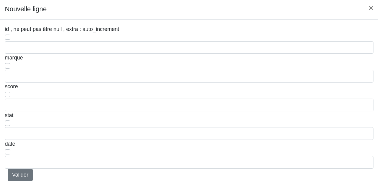 Le bouton permet d’ajouter un enregistrement dans la vue et dans la table en base de données. Pour ce faire, il ouvre une fenêtre comme celle-ci :