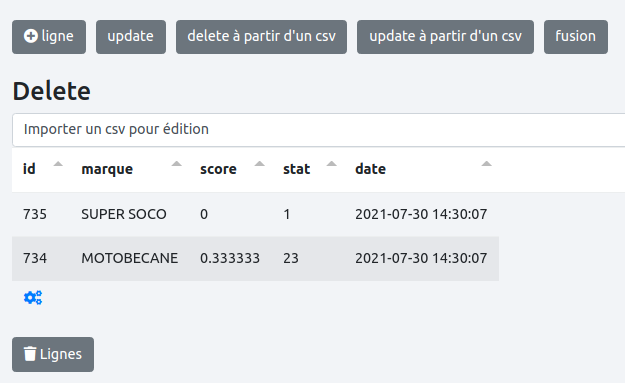 Comme pour l’update, cliquer sur fait apparaître sa section. L?objectif est ici de supprimer des lignes à partir d’un fichier csv.