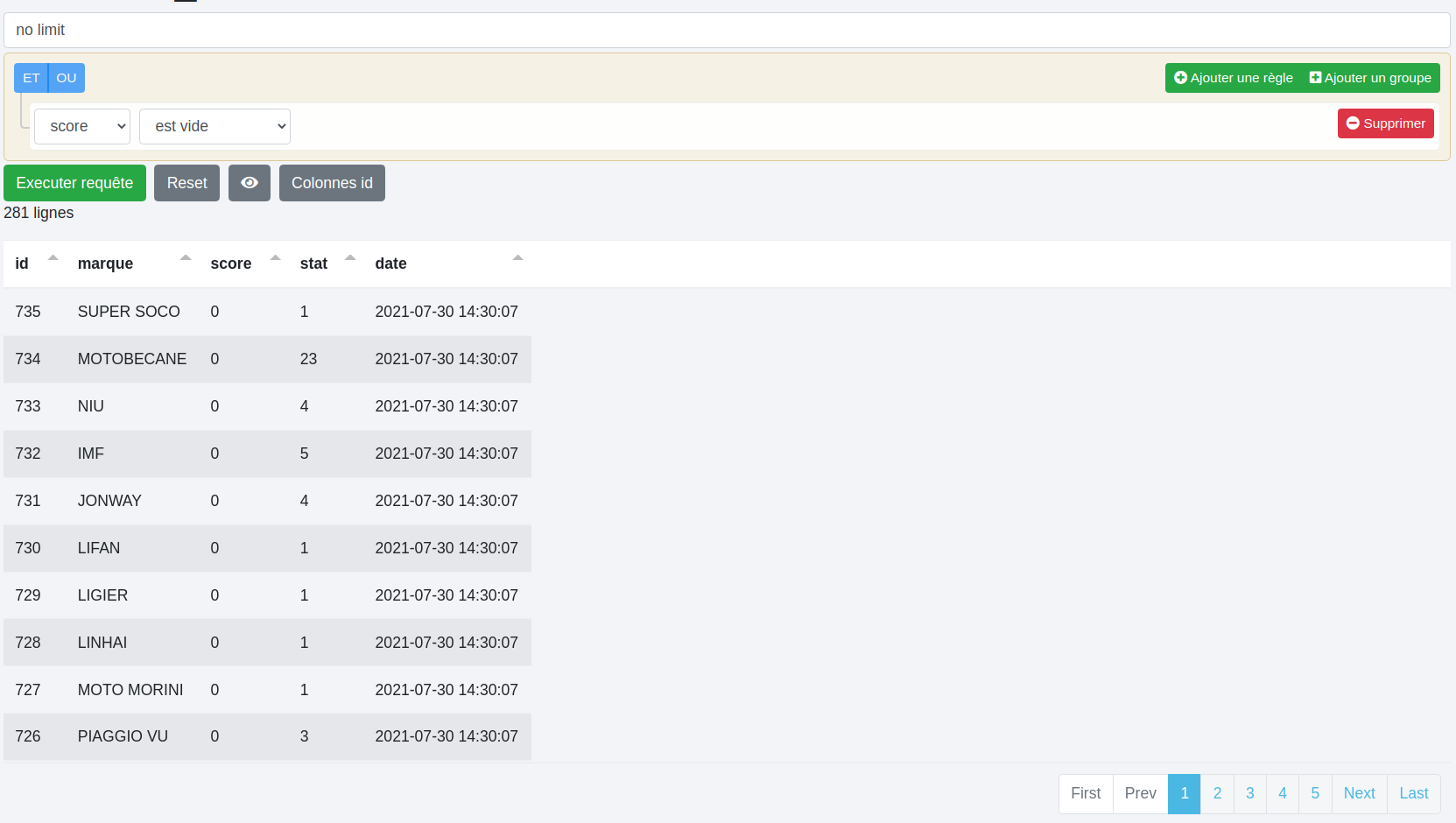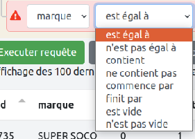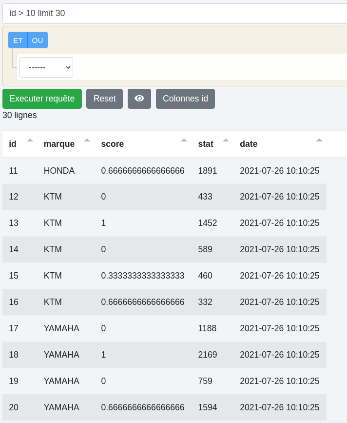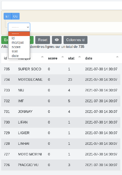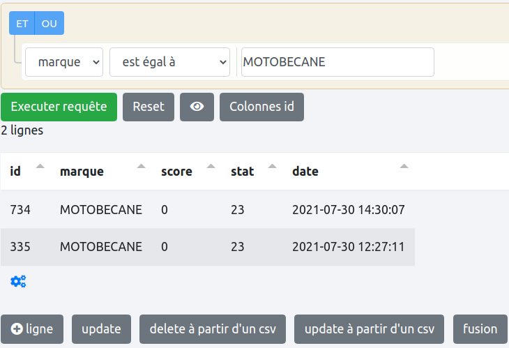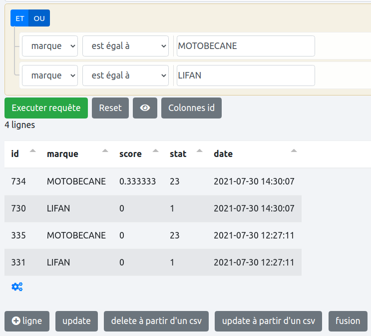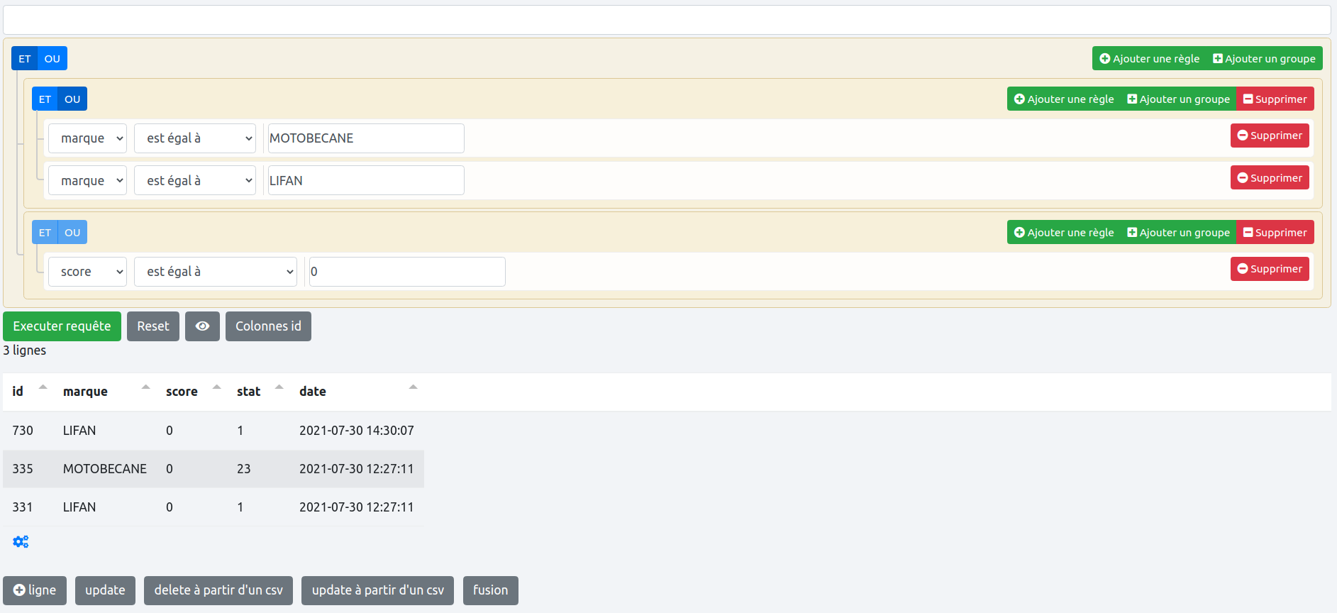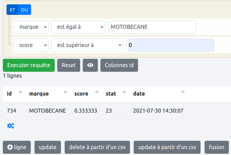 Il est possible d’enchaîner les requêtes articulées autour des "ET" et des "OU". Par exemple, je recherche ici les lignes dont la marque est MOTOBECANE et dont le score est supérieur à 0.