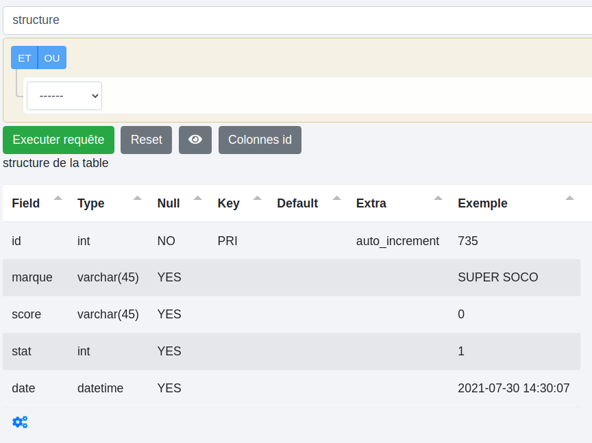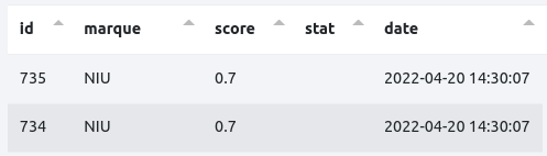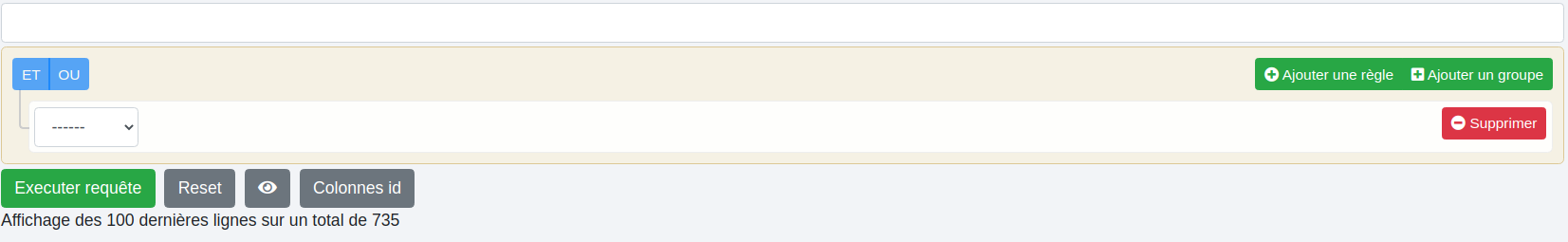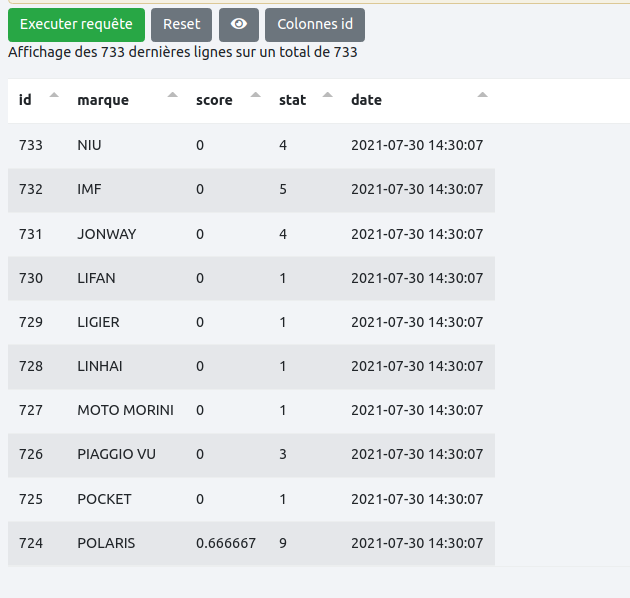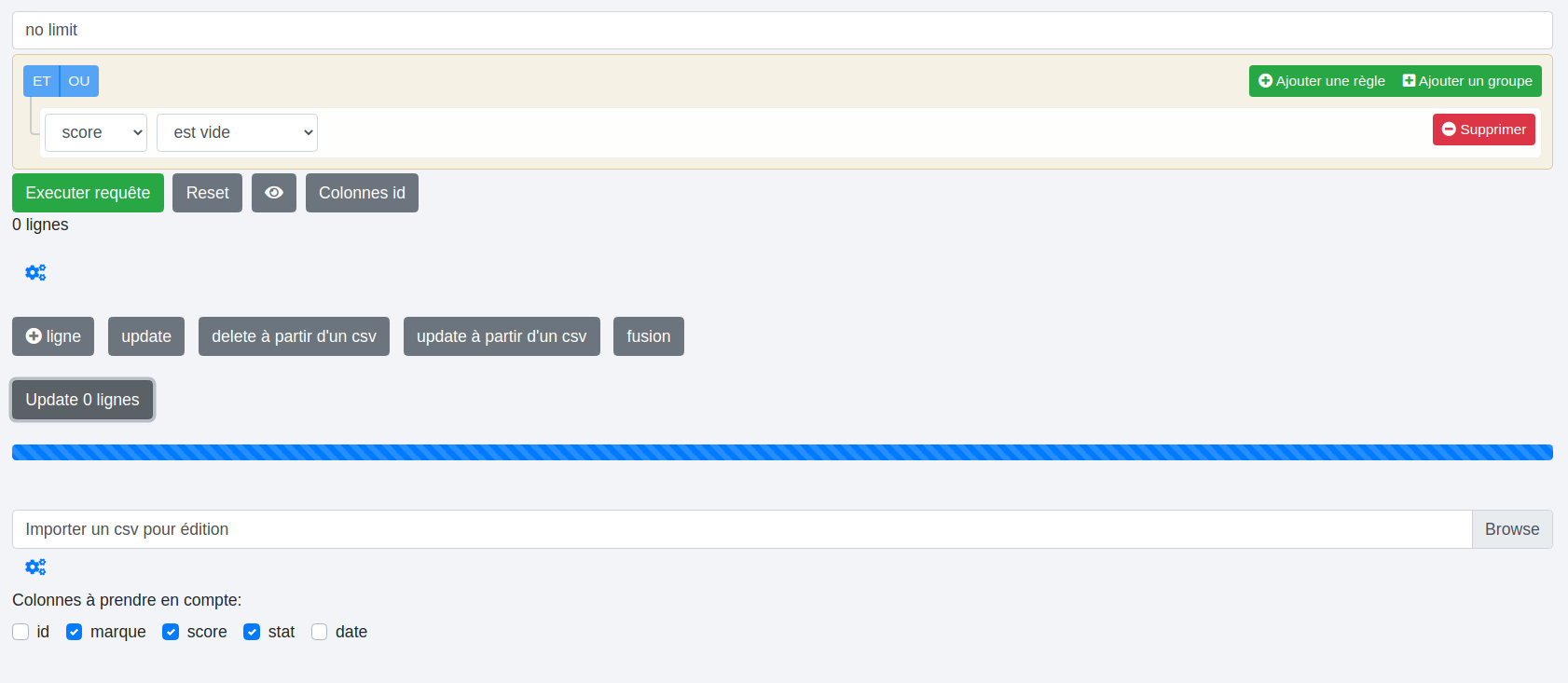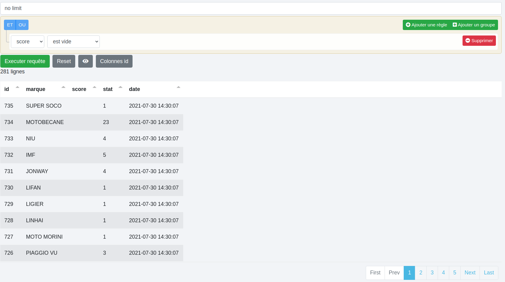 Il est possible d’enchaîner les requêtes articulées autour des "ET" et des "OU". Par exemple, je recherche ici les lignes dont la marque est MOTOBECANE et dont le score est supérieur à 0.