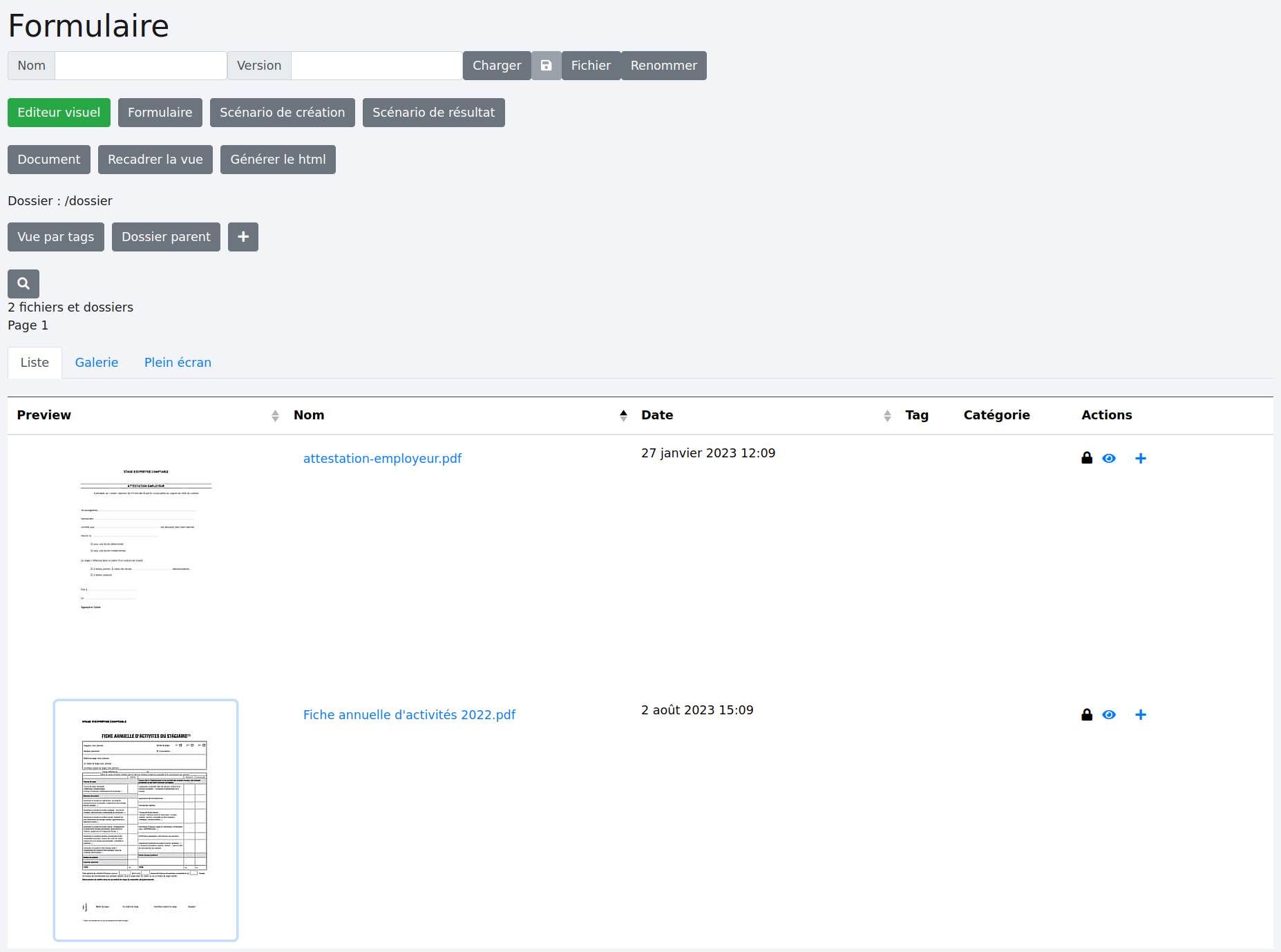 Cette prévisualisation permet également de tester le bon fonctionnement du formulaire et de visualiser les résultats. Prenons notre fiche annuelle d’activités. Nous avons les champs pour les noms et les prénoms et avons ajouté trois checkbox pour les années de stage ainsi qu’un bouton de validation. Nous voulons tester les checkbox.