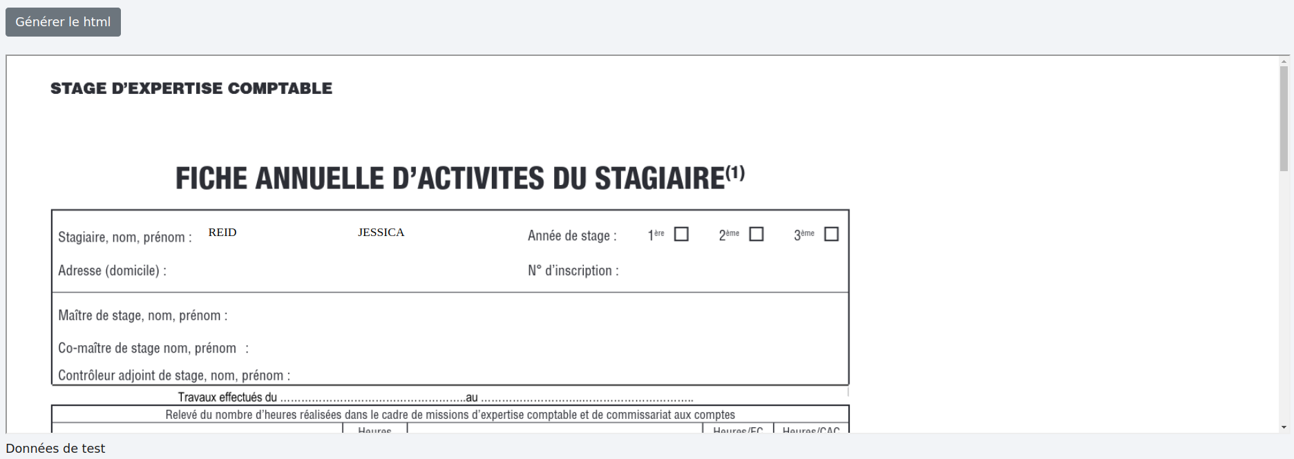Après la génération du code HTML, les variables sont bien remplacées par les données du premier enregistrement de la table de test :