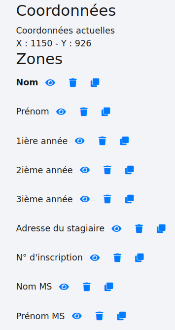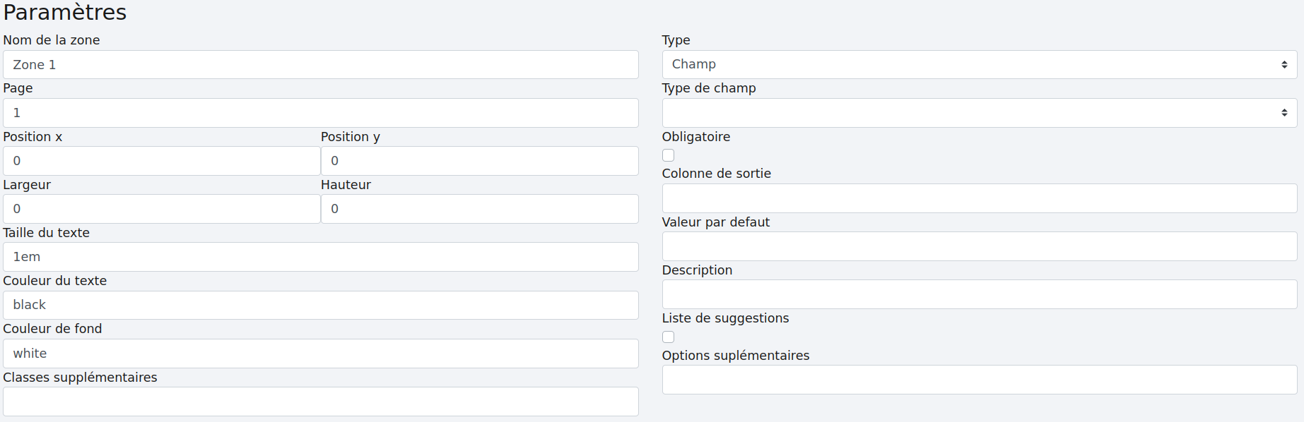 Une zone correspond à un champ du formulaire html. Sa définition va permettre de créer précisément le champ et ses caractéristiques. La section à droite de la fenêtre du document liste toutes les zones.