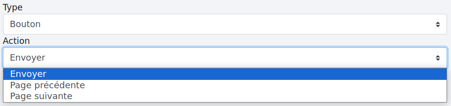 Permettent la navigation au sein des pages du formulaire. Ces boutons correspondent à des balises<input>de type "button". Comme pour le bouton "Envoyer", le paramètre "texte" permet de personnaliser son nom. Voici leurs apparences par défaut :