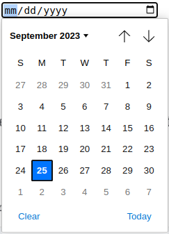 Cette option permet de saisir une date (jour, mois, année) à travers un calendrier dont la forme varie en fonction des navigateurs.