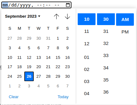 Cette option permet de sélectionner une date et une heure (jour, mois, année, heures, minutes) à travers un calendrier dont la forme varie en fonction des navigateurs.