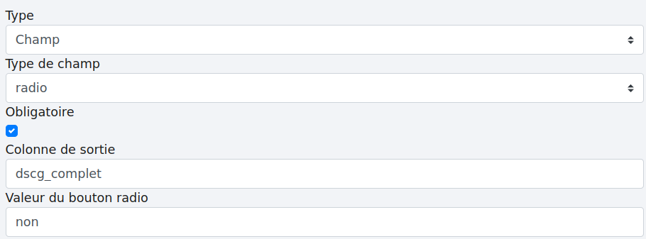 Les deux boutons radio sont cochés car ils sont tous les deux "obligatoires" et les résultats des deux champs sortent dans deux colonnes distinctes avec des valeurs contradictoires. Ce qui est impossible à traiter correctement.