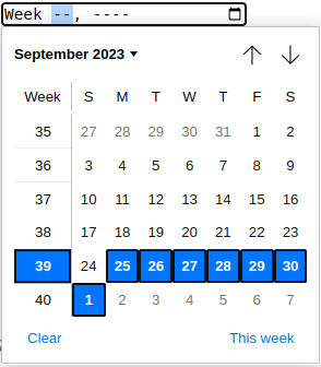 Similaire au champ "month", le calendrier permet ici d’entrer le n° de la semaine et l’année. Sa présentation varie selon les navigateurs.