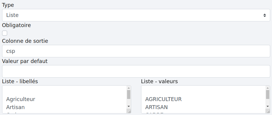 - Les valeurs sont les valeurs correspondant aux libellés qui seront enregistrées en base de données. Elles peuvent être différentes des libellés comme ici où les CSP sont normalisées en majuscules.