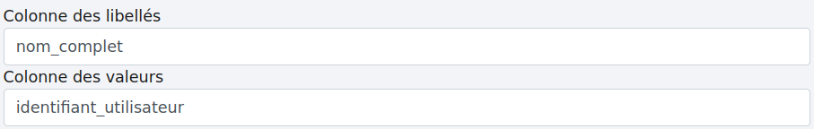 Nous voulons présenter les experts-comptables par leurs noms complets et par ordre alphabétique. La colonne "nom_complet" sera donc les libellés. Quant aux valeurs, nous avons uniquement besoin de leurs identifiants. On passera donc la colonne "identifiant_utilisateur" en valeurs.